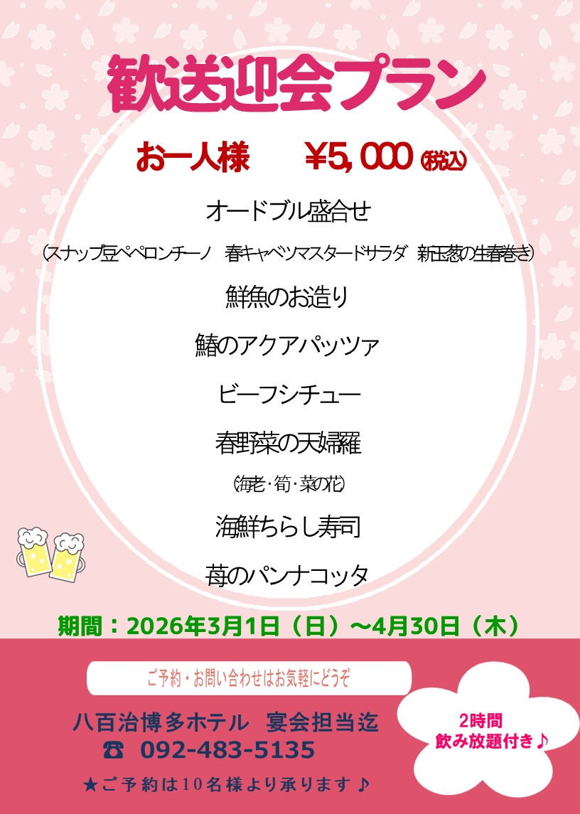 2026年 3月1日(日)~ 2026年 4月30日(木)の間、期間限定で【 歓送迎会プラン 】を開催いたします。